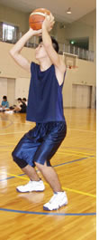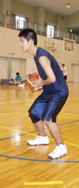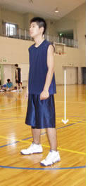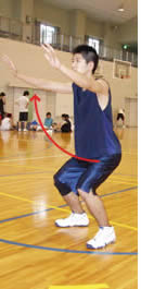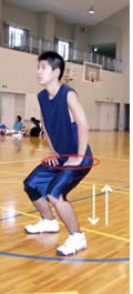 2>>>手をももの付け根に置き、押してみる。押しながら、リラックスした姿勢で、ヒザの中にバネがあるイメージをもち、そのバネで体を上下に動かしてみる。ボヨン、ボヨン、ボヨンつーかんじ。手のおき方は指先が内側を向くようにしてヒジは曲げます。能のような手のおき方です。(写真を参照) バネはヒザだが体の幹は赤い丸のあたりにある。必ずです。 3>>>そのままボールキャッチの姿勢をとれば「キャッチ」両手を横に大きく広げるなら「ディフェンスの基本姿勢」 4>>>ボールを持ちシュート姿勢をするなら「シュート」のカタチになります。 5>>> ピボットの初期動作もパワーポジションです。練習の時、このポーズをいつも意識し、ちゃんとつくってからランニング、スクエアパスやドリブルをやりましょう。 >>Mac用なんですが、観られるようでしたら・・・高校生のパワーポジションからのジャンプショットです。大きく移動し、ディフェンスをかわして打つ初歩の練習です。 |